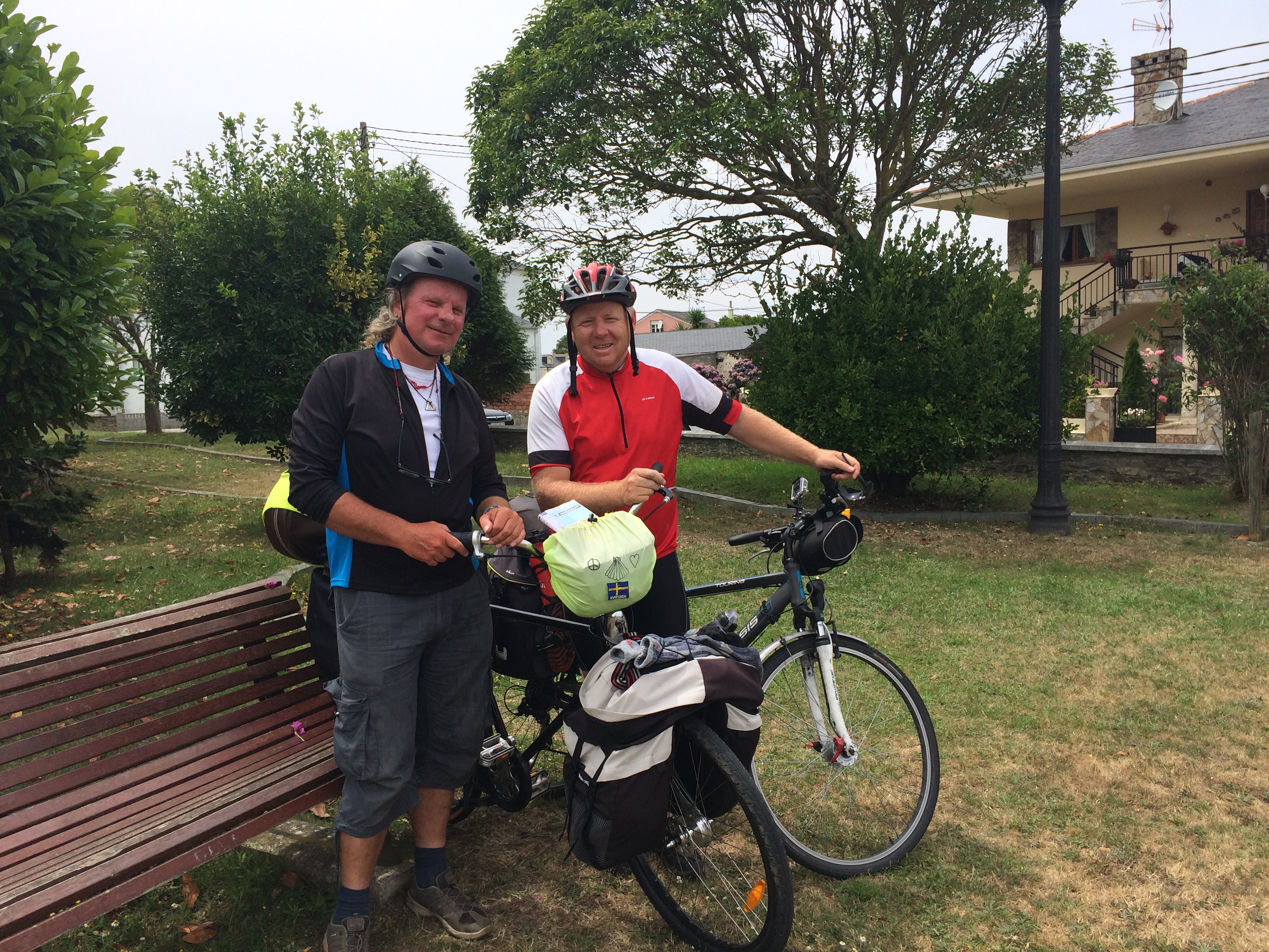 On the road again tj przy muzyce Katie Melua znów odnalazłem Class’a ze Szwecji. To już dzień trzydziesty czwarty. Clas okazał się super kompanem (uprościłem wymowę ale za zgodą i sugestią kompana). Każdy kto wyrusza sam w taką idiotyczną podróż ma wielką chęć spotkać kompana, z którym wiele zwojuje. On wyruszył ze Szwecji dążąc do Santiago de Compostela, ja z Polski ale planując podążyć trochę dalej… Wydaje mi się , że każdy z nas poznawszy kogoś na odpoczynku po wspaniałych i miłych chwilach ucieka szybko w dalszą podróż, bo w sumie rzeczy każdy z nas jest samotnikiem nie szukającym przyjaciół tylko samych siebie. I tak było z nami , po wspaniałym wieczorze pojechaliśmy w tym samym kierunku ale każdy na swój sposób. Kolejne spotkanie na drodze po dwóch dniach , statystycznie nie jest wielce prawdopodobne więc to już przyjaźń i zrządzenie losu, które trzeba potraktować poważnie jak z Baskami we wcześniejszych opisach.