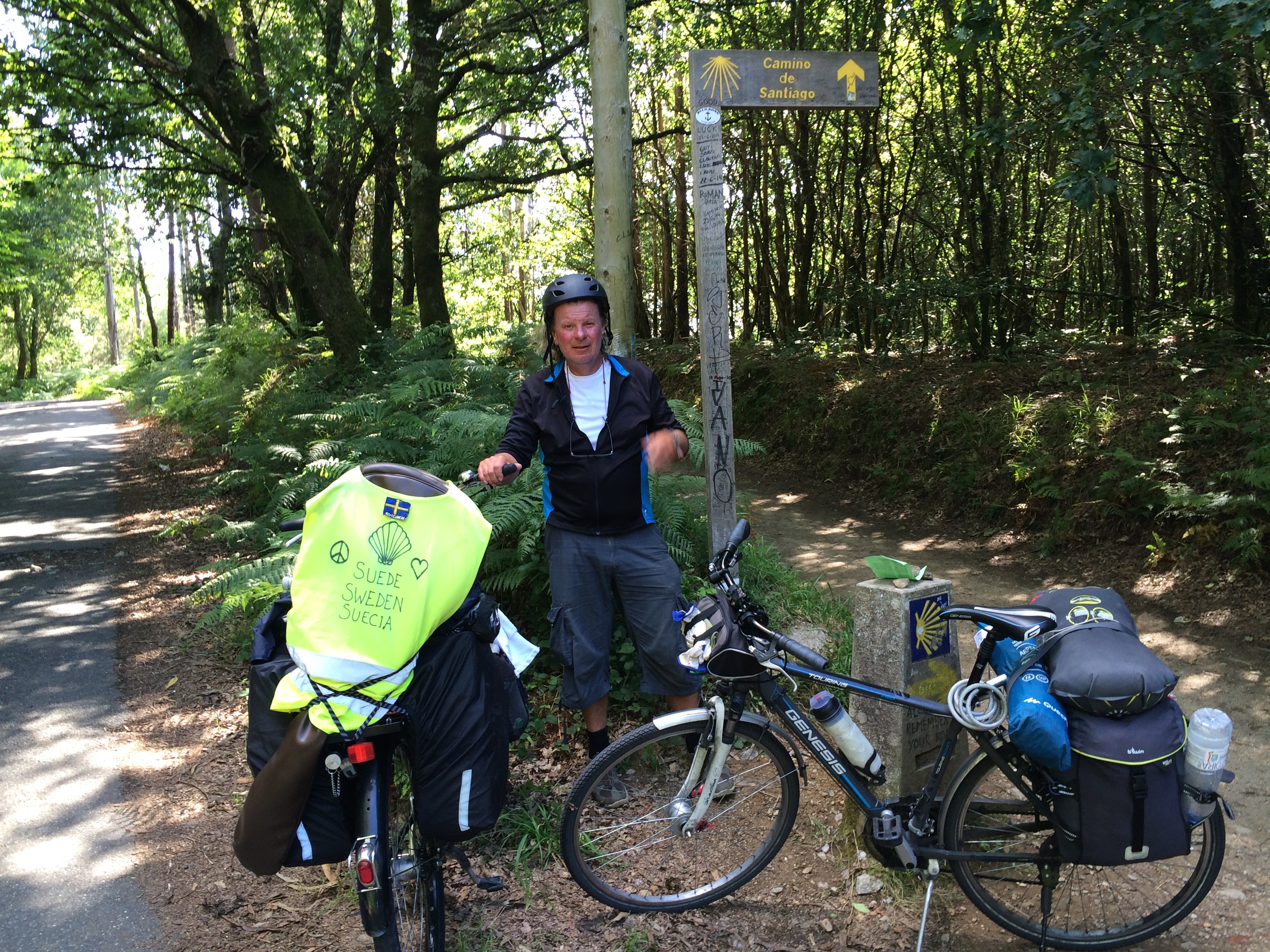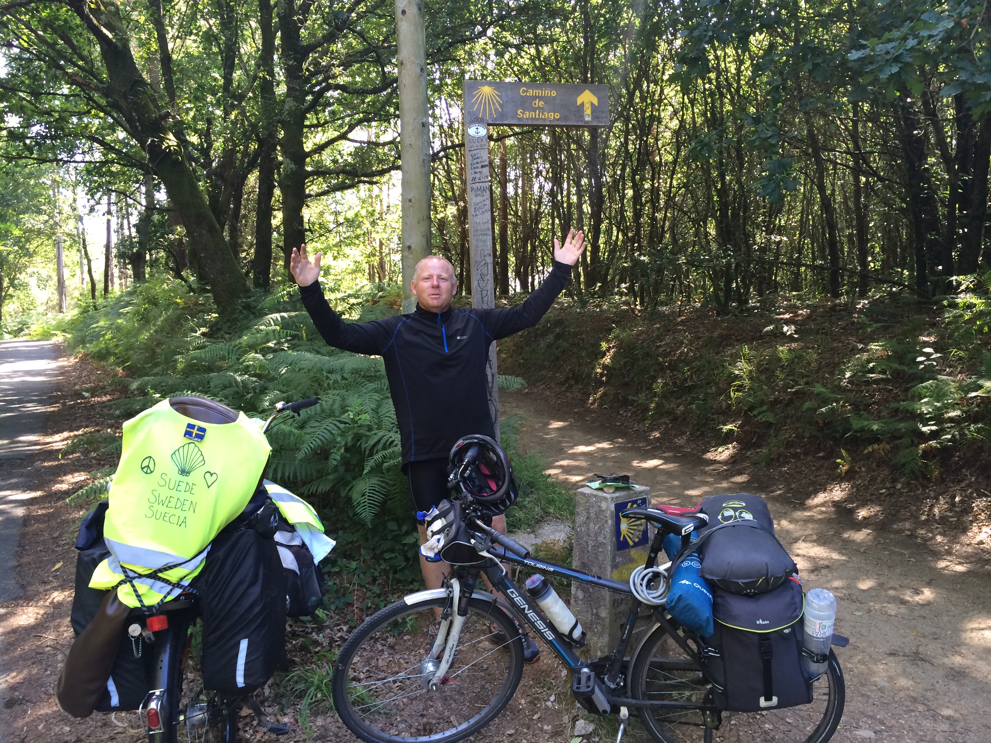 Soy un Robertus ! A więc stało się: zdobyłem Santiago de Compostela rowerem – a wszystko to w dzień trzydziesty siódmy! Wedle zwyczaju mogę używać starodawnego imienia tj Robertus. Nie było łatwo: najpierw zaatakował upał którego od dawna tu nie było, potem zniechęcały strasznie długie górki, awaria hamulców, bagażnika a na sam koniec zaskoczyło same Santiago, które jest tak ukształtowane, że ostatnie 10km niemal płakaliśmy z bólu. Więcej jutro jeśli będę w stanie się podnieść…. W chwili słabości pierwszy raz krzyczałem, że ja chcę do domu…. i niedaleko mnie odezwał się głos: “daj sobie chłopie spokój i nie rycz jak świnia”…. świat jest strasznie mały, okazało się że napotkałem pierwszą grupę z Polski. Po wspaniałej wymianie grzeczności szybko jednak szybko odjechaliśmy z Claesem ze Szwecji, który towarzyszył mi kilka ostatnich dni. Zmęczenie sięga dziś zenitu a miało być łatwo, przyjemnie i z górki – Soy un Robertus to cała formalna satysfakcja 🙂